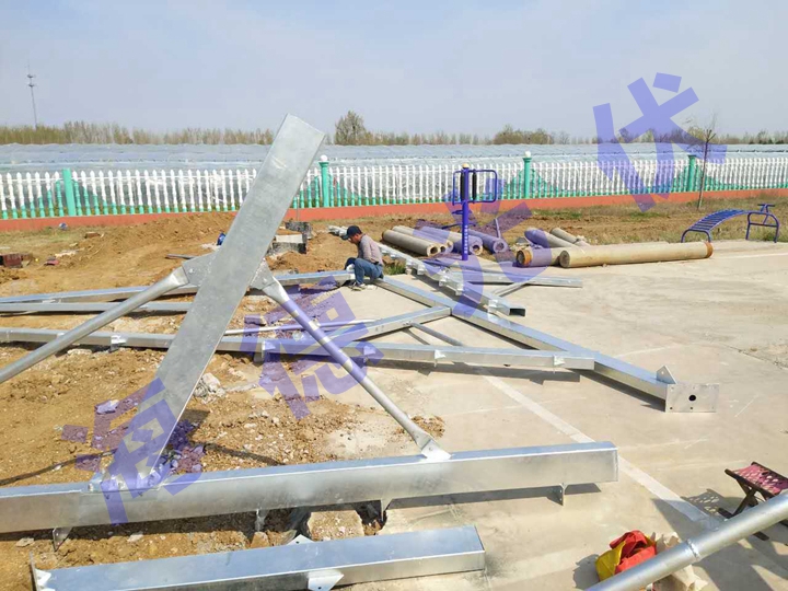 光伏支架進場組裝,表層為熱鍍鋅的碳素鋼光伏支架,堅固耐用抗腐蝕,使用壽命可達二十年以上。
