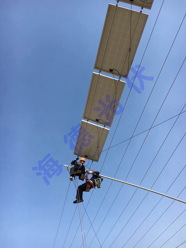 遠(yuǎn)遠(yuǎn)望去,整套光伏電池板就像飄在空中一樣,令人嘆為觀止。