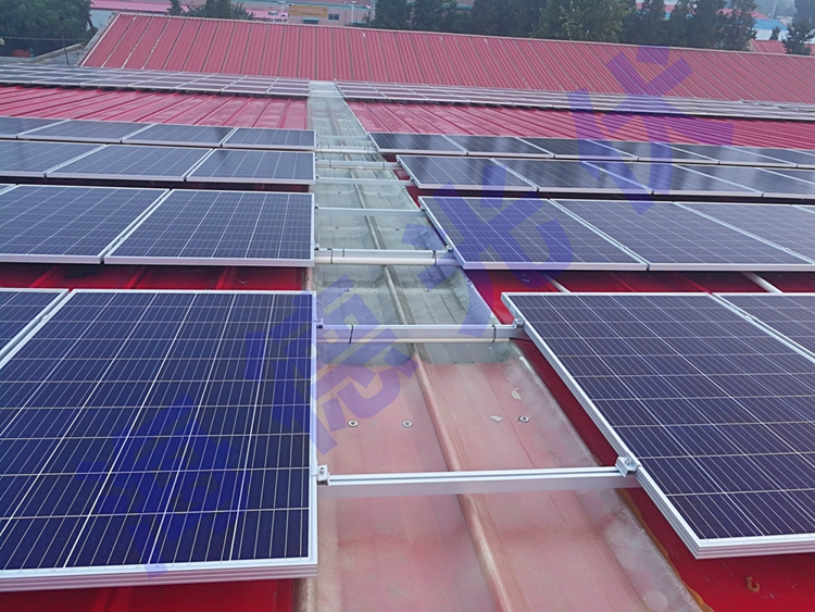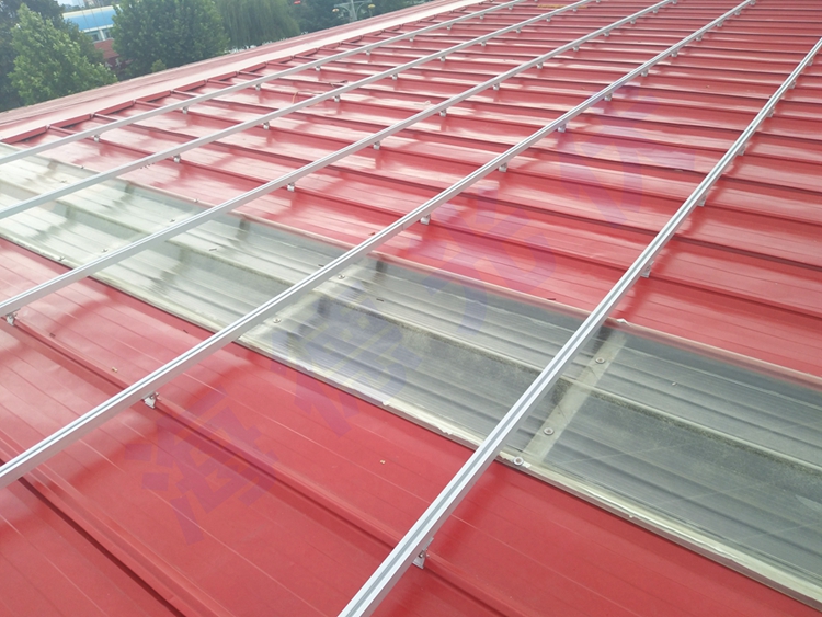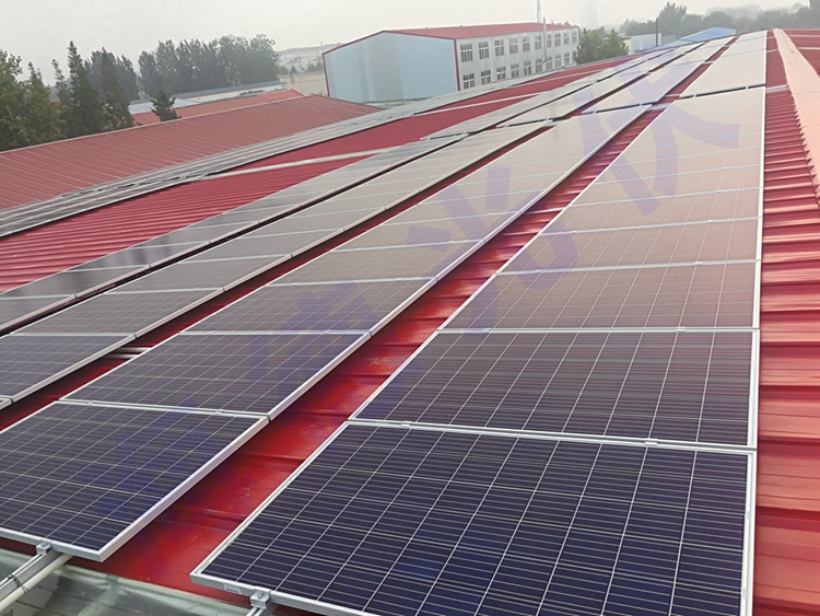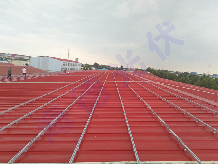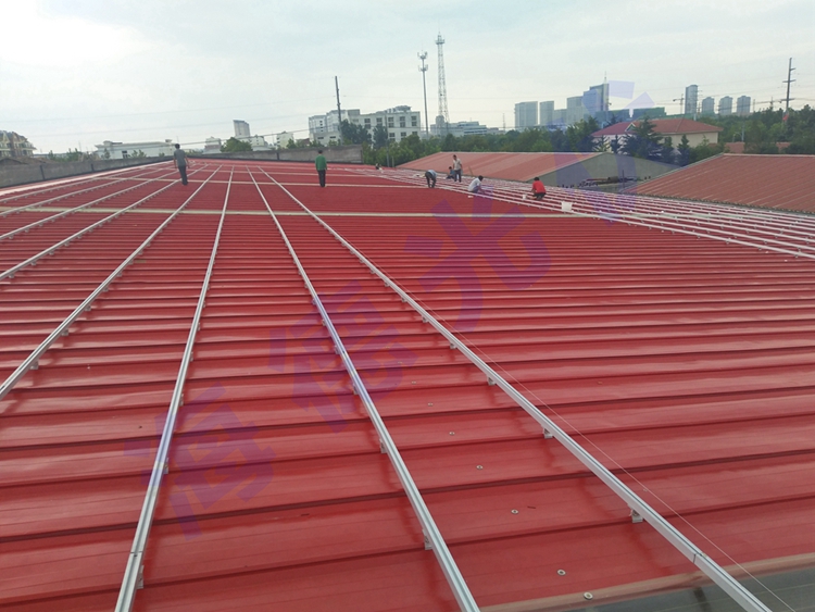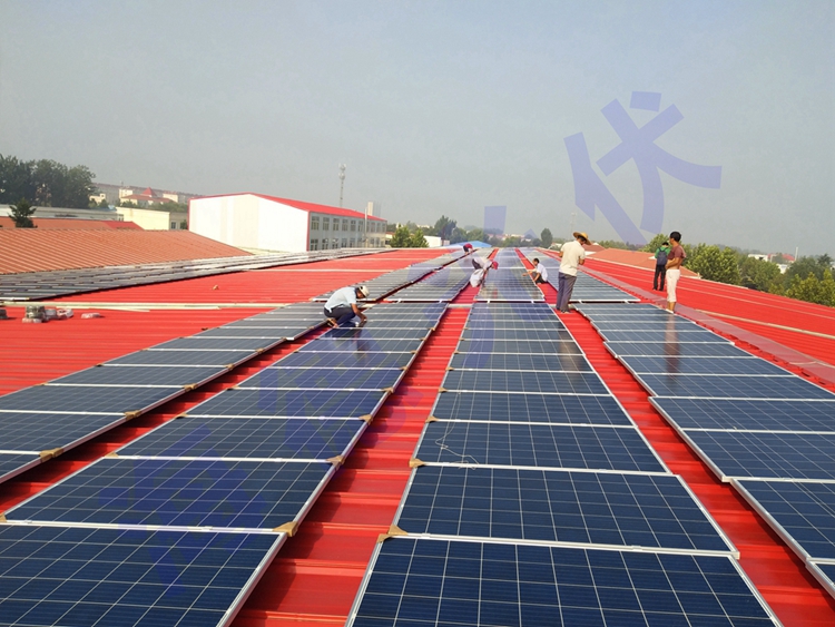 該企業(yè)廠房屋頂為彩鋼瓦,在上面鋪設(shè)導(dǎo)軌,用夾具固定在彩鋼瓦上,導(dǎo)軌上擺放太陽能光伏電池板,整套電站長度達(dá)到75米,安裝容量為151.2KW。