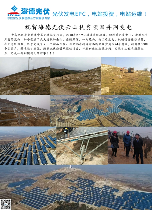 本項目位于平度市云山鎮(zhèn)公家村附近的荒山上,是平度市乃至青島市截至目前安裝規(guī)模最大的村鎮(zhèn)光伏電站扶貧工程。該項目安裝總?cè)萘?/span>1.72MW,占地面積約33000平米,由青島市政府扶貧資金出資建設(shè),項目總計投資預(yù)算17257244.8元(壹仟柒佰貳拾伍萬柒仟貳佰肆拾肆元捌角整)。