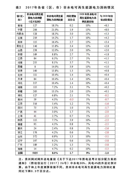 2017年,全國(guó)非水電可再生能源電力消納量為5025億千瓦時(shí),同比增加35.2%,占全社會(huì)用電量比重為8.0%,同比上升1.7個(gè)百分點(diǎn)。綜合考慮各?。▍^(qū)、市)本地生產(chǎn)、本地利用以及外送電力消納可再生能源電量情況,2017年,各?。▍^(qū)、市)非水電可再生能源電力消納量占本地區(qū)全社會(huì)用電量的比重如表2。