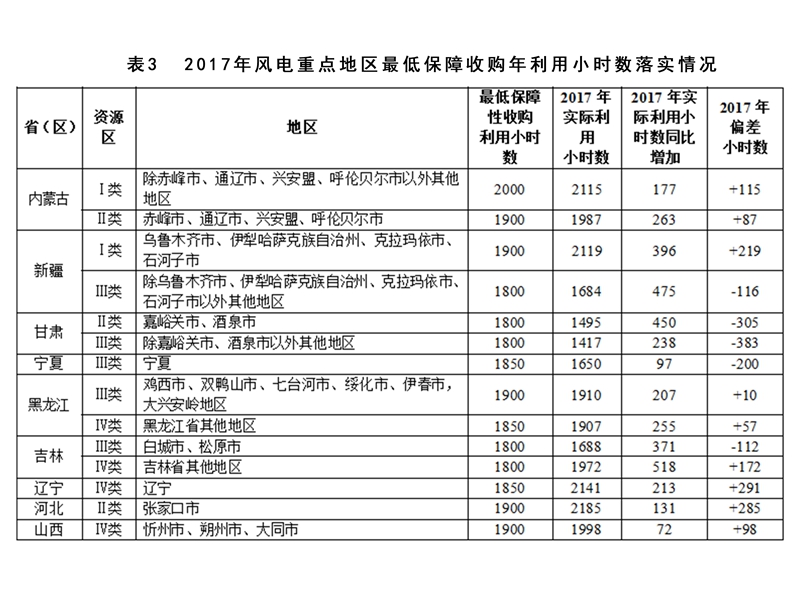 2017年,全部規(guī)定風(fēng)電最低保障收購(gòu)年利用小時(shí)數(shù)的地區(qū)的風(fēng)電實(shí)際發(fā)電小時(shí)數(shù)較2016年均增加,但新疆Ⅲ類資源區(qū)、甘肅、寧夏、吉林Ⅲ類資源區(qū)未達(dá)到風(fēng)電最低保障收購(gòu)年利用小時(shí)數(shù)要求。其中,甘肅Ⅱ類和Ⅲ類資源區(qū)實(shí)際利用小時(shí)數(shù)與最低保障收購(gòu)年利用小時(shí)數(shù)偏差分別為-305小時(shí)和-383小時(shí);寧夏由于來風(fēng)情況偏差,偏差為-200小時(shí);新疆Ⅲ類資源區(qū)和吉林Ⅲ類資源區(qū)偏差分別為-116小時(shí)和-112小時(shí)。其他地區(qū)達(dá)到風(fēng)電最低保障收購(gòu)年利用小時(shí)數(shù)要求。