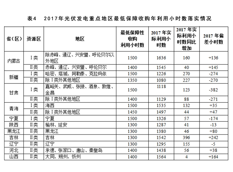 2017年,內(nèi)蒙古、青海、黑龍江、吉林、山西II類地區(qū)、河北II類地區(qū)達(dá)到光伏發(fā)電最低保障收購(gòu)年利用小時(shí)數(shù)要求,五個(gè)?。▍^(qū))未達(dá)到要求,其中,甘肅I類和II類地區(qū)實(shí)際利用小時(shí)數(shù)與最低保障收購(gòu)年利用小時(shí)數(shù)偏差分別為-382小時(shí)和-271小時(shí),新疆I類和II類地區(qū)偏差分別-274小時(shí)和-270小時(shí),寧夏偏差-174小時(shí),陜西II類地區(qū)偏差-13小時(shí),遼寧偏差-5小時(shí)。