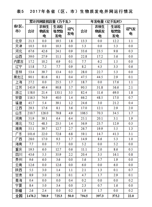 截至2017年底,全國(guó)共有30個(gè)?。▍^(qū)、市)投產(chǎn)了747個(gè)生物質(zhì)發(fā)電項(xiàng)目,并網(wǎng)裝機(jī)容量1476.2萬(wàn)千瓦(不含自備電廠),年發(fā)電量794.5億千瓦時(shí)。其中農(nóng)林生物質(zhì)發(fā)電項(xiàng)目271個(gè),累計(jì)并網(wǎng)裝機(jī)700.9萬(wàn)千瓦,年發(fā)電量397.3億千瓦時(shí);生活垃圾焚燒發(fā)電項(xiàng)目339個(gè),累計(jì)并網(wǎng)裝機(jī)725.3萬(wàn)千瓦,年發(fā)電量375.2億千瓦時(shí);沼氣發(fā)電項(xiàng)目137個(gè),累計(jì)并網(wǎng)裝機(jī)50.0萬(wàn)千瓦,年發(fā)電量22.0億千瓦時(shí)。生物質(zhì)發(fā)電累計(jì)并網(wǎng)裝機(jī)排名前四位的省份是山東、浙江、江蘇和安徽,分別為210.7萬(wàn)、158.0萬(wàn)、145.9萬(wàn)和116.3萬(wàn)千瓦;年發(fā)電量排名前四位的省份是山東、江蘇、浙江和安徽,分別是106.5億、90.5億、82.4億和66.2億千瓦時(shí)。2017年各?。▍^(qū)、市)各類生物質(zhì)發(fā)電并網(wǎng)裝機(jī)及發(fā)電量如下: