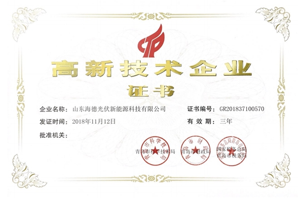 2018年11月12日,山東海德光伏新能源科技有限公司成功取得了國家級高新技術(shù)企業(yè)的認(rèn)定證書,是青島市2018年第一批被認(rèn)定的高新技術(shù)企業(yè)之一,標(biāo)志著公司的管理水平、技術(shù)實力、創(chuàng)新水平等都進(jìn)入到了一個嶄新的階段,同時也會激勵和鞭策公司在不斷前進(jìn)發(fā)展的道路上,做的更好、更高、更強。