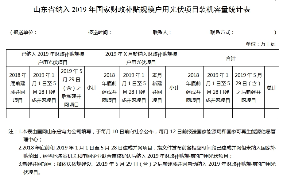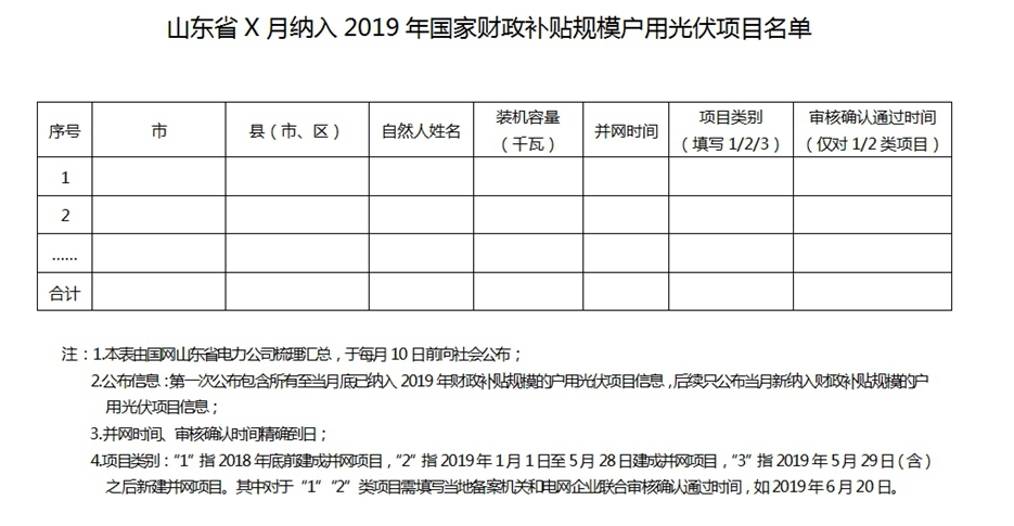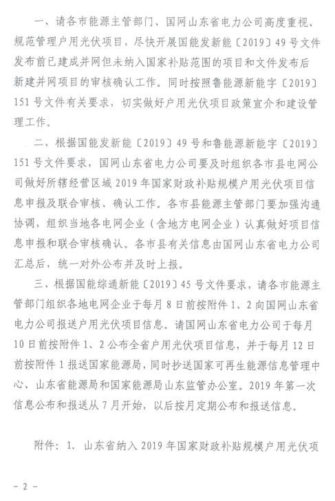 三、根據(jù)國(guó)能綜通新能〔2019〕45號(hào)文件要求,請(qǐng)各市能源主管部門組織各地電網(wǎng)企業(yè)于每月8日前按附件1、2向國(guó)網(wǎng)山東省電力公司報(bào)送戶用光伏項(xiàng)目信息。請(qǐng)國(guó)網(wǎng)山東省電力公司于每月10日前按附件1、2公布全省戶用光伏項(xiàng)目信息,并于每月12日前按附件1報(bào)送國(guó)家能源局,同時(shí)抄送國(guó)家可再生能源信息管理中心、山東省能源局和國(guó)家能源局山東監(jiān)管辦公室。2019年第一次信息公布和報(bào)送從7月開始,以后按月定期公布和報(bào)送信息。