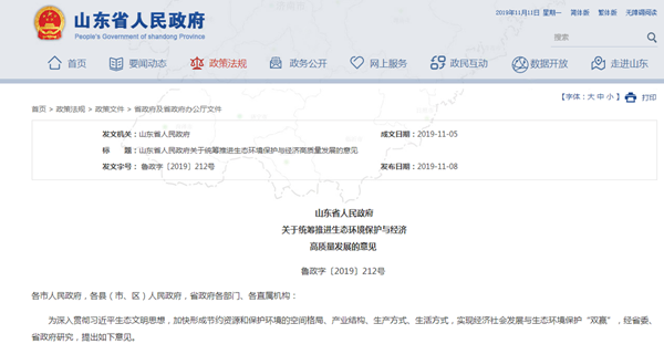 山東省政府發(fā)文《關于統(tǒng)籌推進生態(tài)環(huán)境保護與經(jīng)濟高質量發(fā)展的意見》