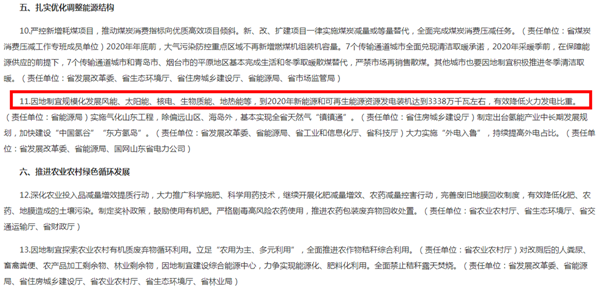 近日,山東省人民政府官網(wǎng)發(fā)布《關于統(tǒng)籌推進生態(tài)環(huán)境保護與經(jīng)濟高質量發(fā)展的意見 》(魯政字〔2019〕212號 )一文,其中指出要扎實優(yōu)化調(diào)整能源結構,嚴控新增耗煤項目,推動煤炭消費指標向優(yōu)質高效項目傾斜。新、改、擴建項目一律實施煤炭減量或等量替代,全面完成煤炭消費壓減任務。因地制宜規(guī)模化發(fā)展風能、太陽能、核電、生物質能、地熱能等新能源,到2020年新能源和可再生能源資源發(fā)電裝機達到3338萬千瓦左右,有效降低火力發(fā)電比重。