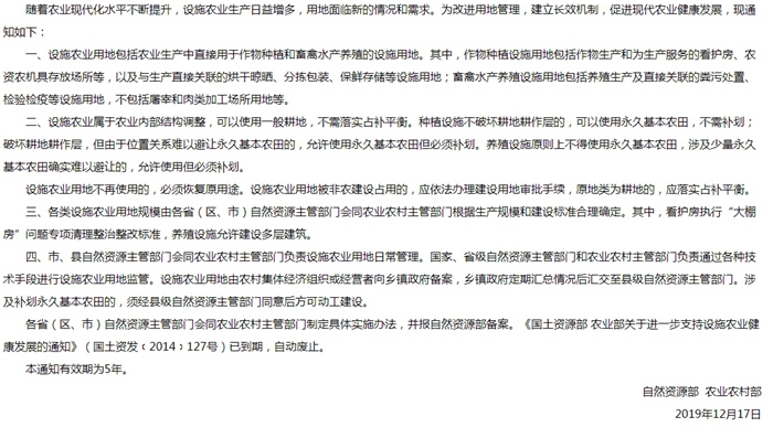 近日,國土資源部官方網(wǎng)站發(fā)布了《自然資源部、農(nóng)業(yè)農(nóng)村部關(guān)于設(shè)施農(nóng)業(yè)用地管理有關(guān)問題的通知》,通知有效期為5年。