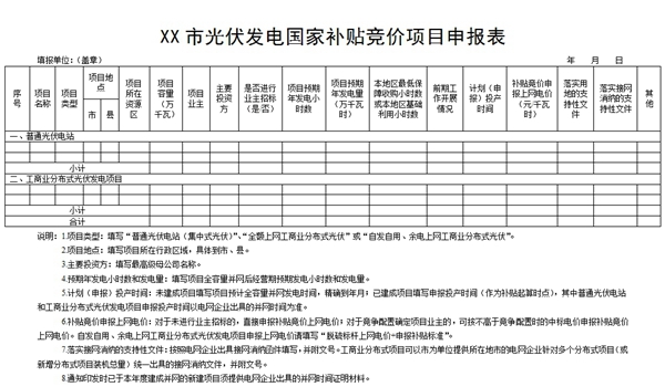 (四)項(xiàng)目提報(bào)。請(qǐng)各市能源主管部門在認(rèn)真組織項(xiàng)目業(yè)主競(jìng)爭(zhēng)配置和嚴(yán)格審核項(xiàng)目名單、申報(bào)材料的基礎(chǔ)上,于6月5日前以正式文件將申報(bào)材料報(bào)省能源局,材料主要包括正式報(bào)告、光伏發(fā)電國(guó)家補(bǔ)貼競(jìng)價(jià)項(xiàng)目申報(bào)表(附件3)、普通光伏電站支持性材料(按項(xiàng)目單獨(dú)裝訂成冊(cè))。以上紙質(zhì)文件一式二份,并附電子版,逾期未報(bào)將不予受理。
