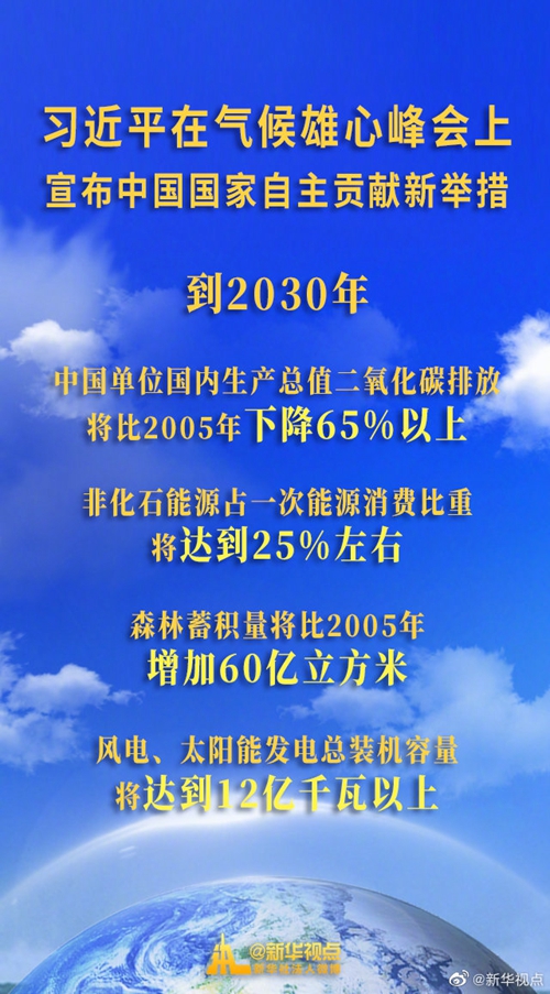 12月12日,國家主席習(xí)近平在氣候雄心峰會上通過視頻發(fā)表題為《繼往開來,開啟全球應(yīng)對氣候變化新征程》的重要講話,宣布中國國家自主貢獻(xiàn)一系列新舉措。