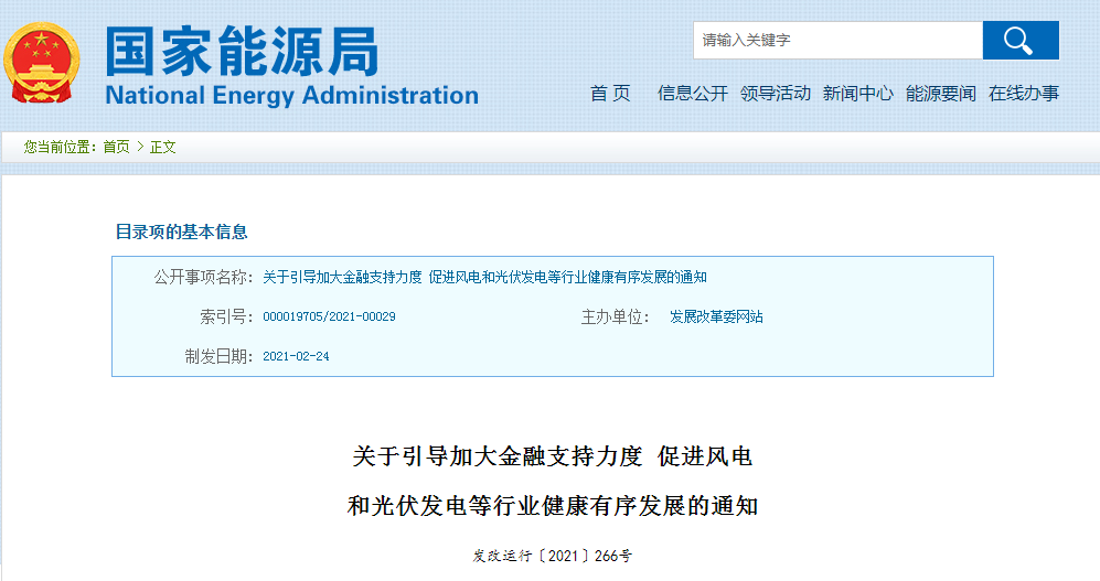 近日,國家能源局聯(lián)合多部委下發(fā)文件——《關(guān)于引導(dǎo)加大金融支持力度 促進(jìn)風(fēng)電和光伏發(fā)電等行業(yè)健康有序發(fā)展的通知》(發(fā)改運(yùn)行〔2021〕266號(hào)),支持我國光伏發(fā)電、風(fēng)電等行業(yè)健康有序發(fā)展,原文如下: