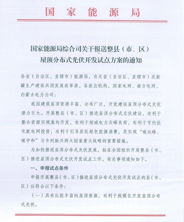 國家能源局發(fā)布報送整縣(市、區(qū))屋頂分布式光伏開發(fā)試點方案的通知